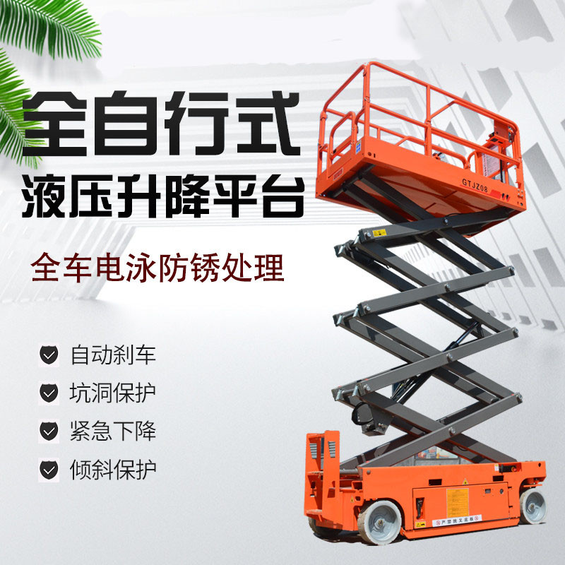 全自行式升降平臺是一種多功能起重裝卸機械設備。起升高度從1米至20米不等,可根據個人要求訂做特殊規格的平臺。自行式升降平臺一般采用高強度合金材質,結構堅固,使升降機的偏轉與擺動極小。具有自動行走功能,可選三項電源控制和電瓶控制行走,能夠在不同工作狀態下,不需外接電源,手柄控制行走,速度可調式,移動靈活、操作方便、升降自如,只需一人便可完成前進、后退、轉向、快、慢速行走和上下等動作,省工、省力。特別適用于車站、碼頭、機場、電廠、體育場館、大型企業等較大范圍的高空作業。